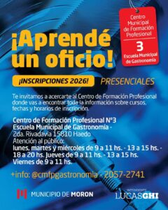 El Municipio de Morón abrió las inscripciones presenciales para el ciclo 2026 en los Centros Municipales de Formación Profesional, una propuesta que ofrece más de 40 cursos con salida laboral destinados a vecinos y vecinas que deseen capacitarse en diferentes oficios.