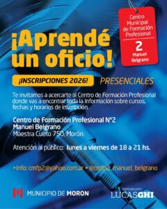 El Municipio de Morón abrió las inscripciones presenciales para el ciclo 2026 en los Centros Municipales de Formación Profesional, una propuesta que ofrece más de 40 cursos con salida laboral destinados a vecinos y vecinas que deseen capacitarse en diferentes oficios.