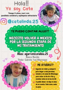 Gabriela Albarenque, mamá de Cata, describe que «el viaje lo estaremos realizando en Julio, pero en Junio necesitamos tener el dinero para costearnos el pasaje y la estadía. Es la segunda vez que viajamos. La evolución de Cata ha sido muy notoria con el tratamiento que recibió el año pasado y vamos con la expectativa que mejore aún más».